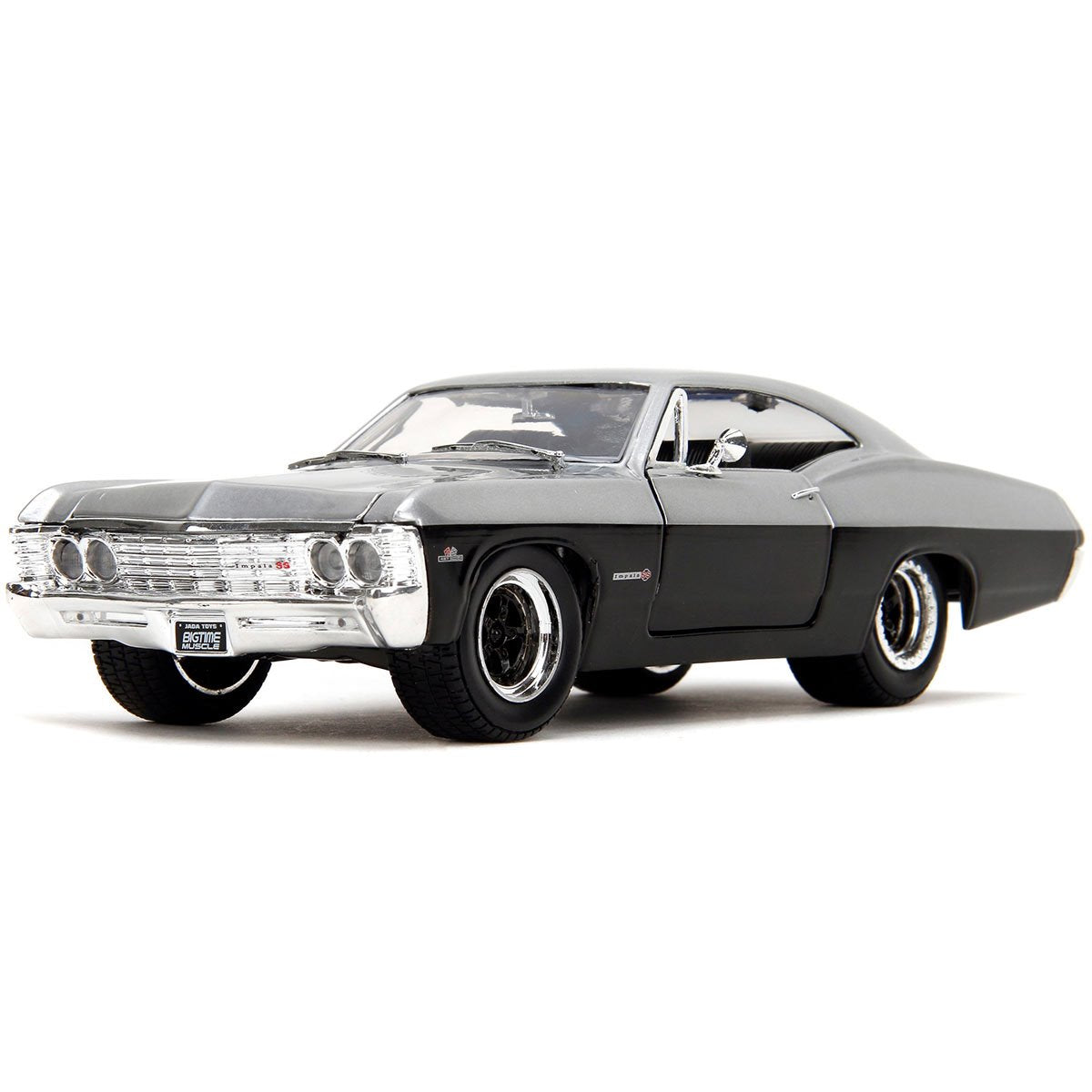 The BTM 1967 Chevy Impala SS in silver and black recreates the classic muscle car at 1:24 scale, combining sleek finish with vintage Super Sport detail.