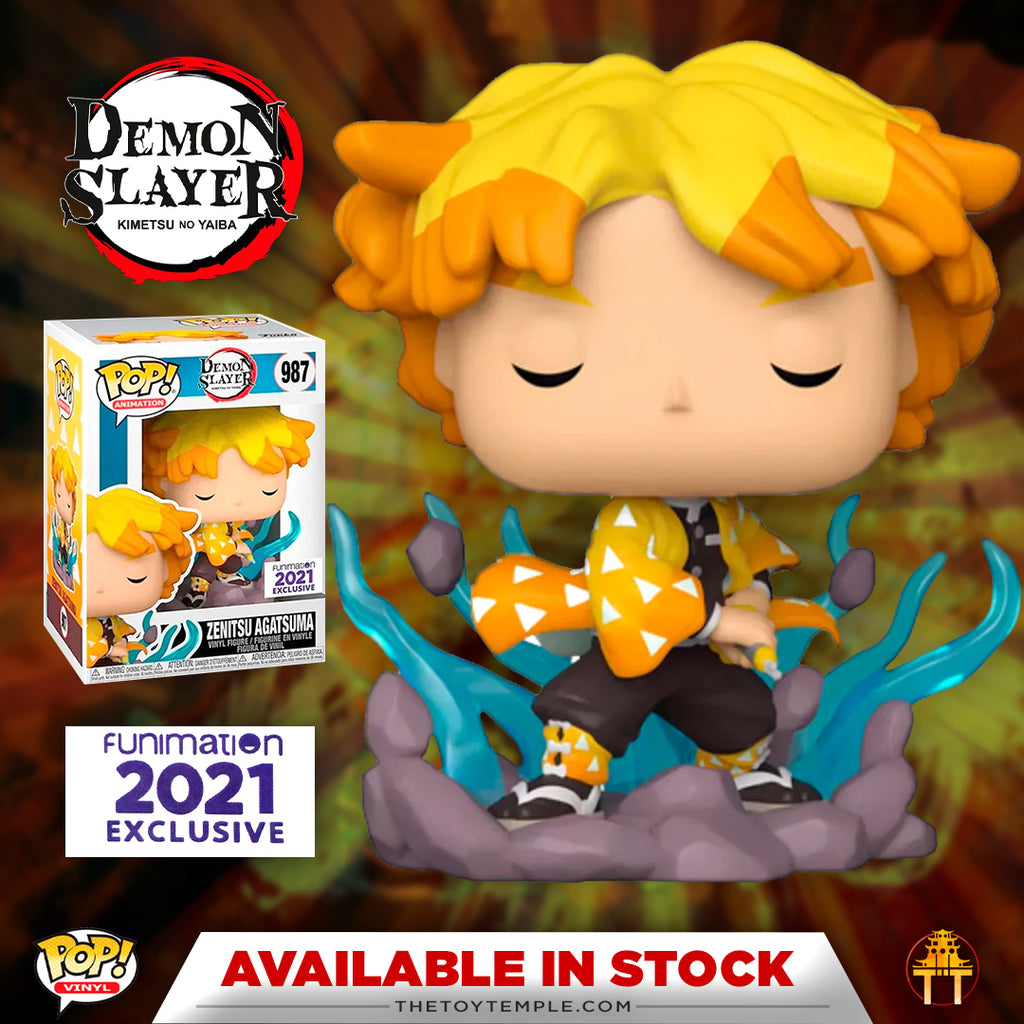 Zenitsu Agatsuma from *Demon Slayer* is frozen in vinyl in Funko Pop #987, showcasing his electrified tension and lightning stance just before a thunderclap flash.