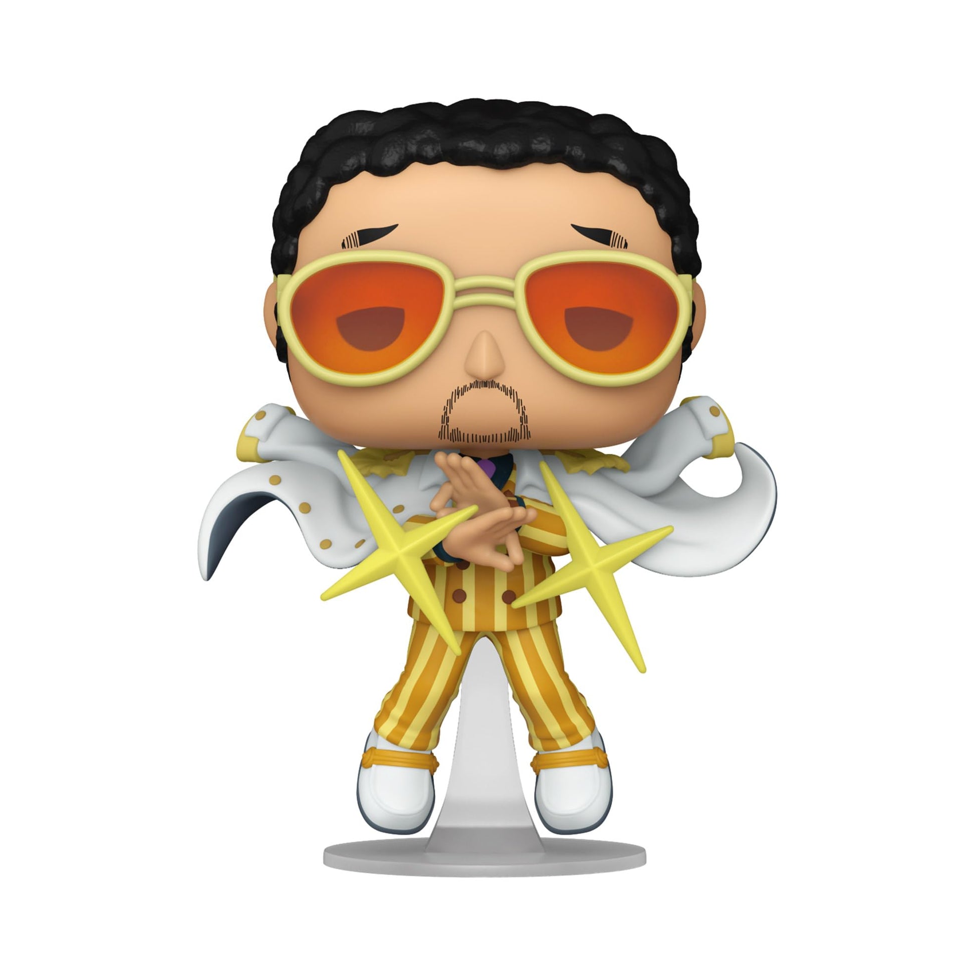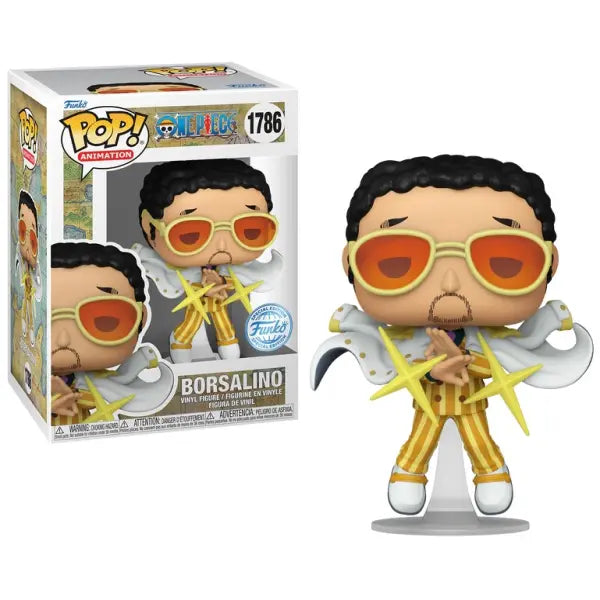 Borsalino enters the One Piece Funko Pop line as #1786, captured in a composed stance with his Marine coat draped, embodying the calm yet destructive power of light.