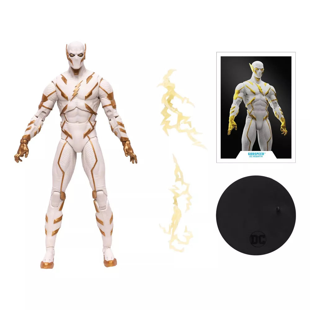 Godspeed - DC Multiverse Harness the speed force with the Godspeed figure from the DC Multiverse! This powerful speedster, known for his electrifying abilities and complex motives, adds a dynamic presence to your collection. Features: Height: Approximately 6.5 inches (16.5 cm) Articulation: Over 20 points of articulation for dynamic posing options Details: Striking design with metallic finishes and intricate details that reflect Godspeed's iconic costume Includes: Accessories (like speed effects) and a display base for showcasing Ideal for collectors and fans of the Flash universe, this Godspeed figure is perfect for recreating high-speed battles or displaying among your favorite heroes and villains. DonÕt miss the opportunity to add this formidable character to your DC lineup!