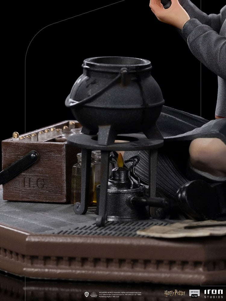 On the second floor of Hogwarts Castle, above the Great Hall, in the dreaded girlÕs bathroom known as the Moaning MyrtleÕs Bathroom, a place avoided by students because itÕs haunted by the ghost called Myrtle Warren, the young student at the wizarding school and Harry Potter and Rony WeasleyÕs best friend, uses her hidden spot to prepare her magic Polyjuice potion. Sitting under the grids in front of the old washbasin, she carefully studies the potions in the flasks she holds, with a box filled with many more, and a small cauldron for the formulaÕs production. With the recipe for that potion and their wand by their side, Iron Studios gathered the perfect ingredients to bring the statue ÒHermione Granger Polyjuice Deluxe Version - Harry Potter - Art Scale 1/10Ó, with the charismatic wizard girl in one of her most memorable scenes presented in the movie ÒHarry Potter and the Chamber of SecretsÓ from 2002, part of the collection that celebrates 20 years of its premiere in the movie theaters. Highly complicated, challenging, and time-consuming, the Polyjuice Potion makes it possible for those who drink it to take someone elseÕs form. Complex even to adult wizards and witches, Hermione prepared it in her Second Year for Harry and Ron to investigate their rival Draco Malfoy about the opening of the Chamber of Secrets, disguised as his friends, Crabbe and Goyle. She also intended to take the form of her rival Millicent Bulstrode and prepared the potion with her improvised laboratory. Harry and Ron successfully transformed, but Hermione mistook MillicentÕs hair with a catÕs hair in her formula, causing her to partially gain feline features, like a face, ears, and the tail of a cat. Since the Polyjuice Potion canÕt be used to transform into an animal, HermioneÕs change wasnÕt reverted after an hour as it should, and so she went to Hogwarts Hospital Wing, staying there up until after the winter vacations. Reproduced down to the tiniest details faithful to the movie, based on the original references, this fantastic statue presents with incredible accuracy the face features of the still young British actress Emma Watson, that played the beloved small and extremely intelligent wizard, committed to being the yearÕs best student. Revealed on the show Inside Iron Studios Day, already available for Pre-Order, this is an unmissable statue for fans, collectors, and Potterheads all over the world, a statue that individually reproduces a diorama set of one of the most remarkable scenes from the saga, just like the statues ÒRon Weasley at the Wizard Chess Deluxe - Harry Potter - Art Scale 1/10Ó and ÒHarry Potter and Buckbeak Deluxe - Harry Potter - Art Scale 1/10Ó by Iron Studios that bring outstanding scenes of her friends in luxurious dioramas. Check out more news from HogwartsÕ magic universe soon by Iron Studios.