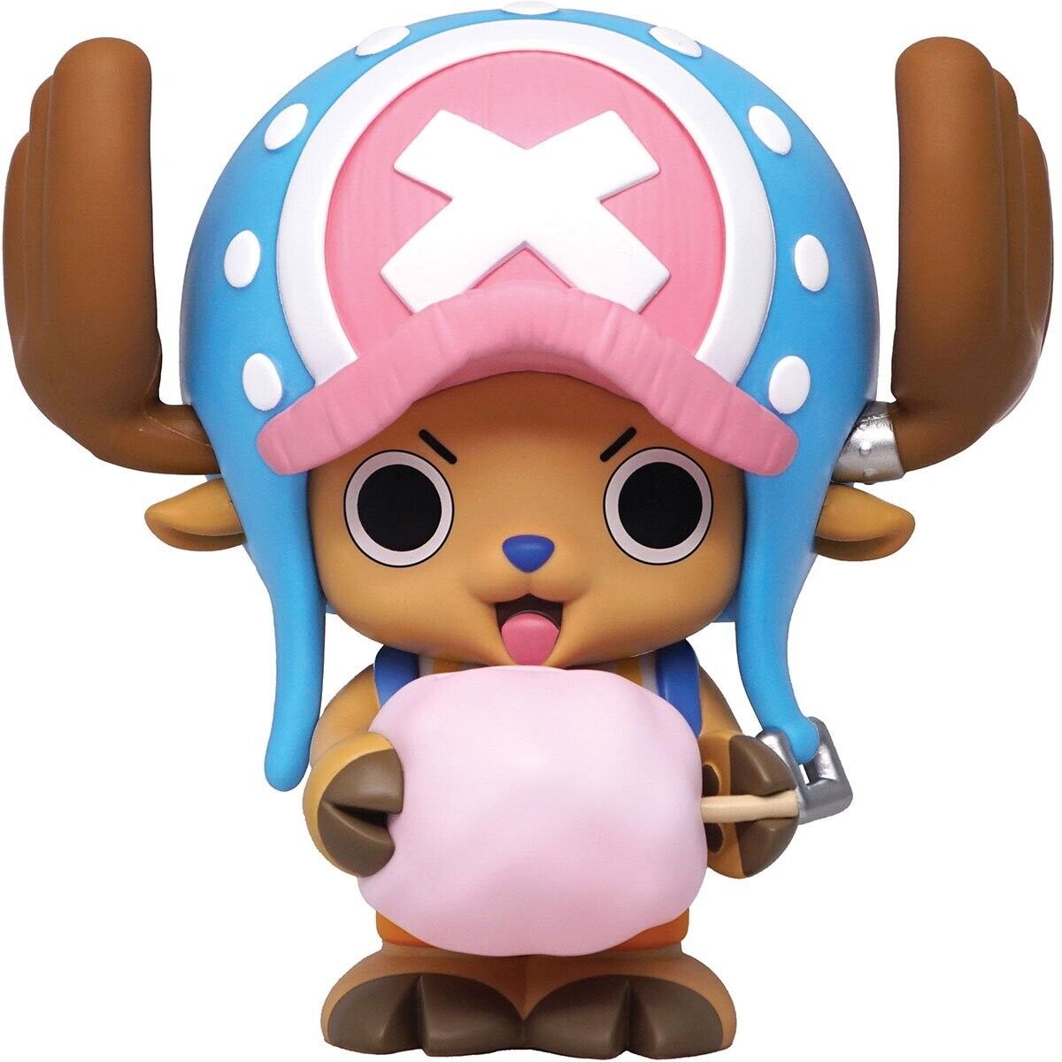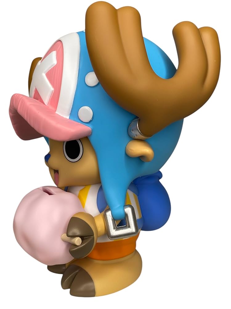 Chopper piggy bank from One Piece anime. Figural PVC coin bank featuring Tony Tony Chopper holding cotton candy. Cute anime money bank for kids, teens, and collectors. Great for anime room decor, One Piece gifts, or collectible display. Durable plastic piggy bank with coin slot on back. Officially styled anime figure bank—perfect for fans of Luffy, Straw Hat Pirates, and One Piece merchandise