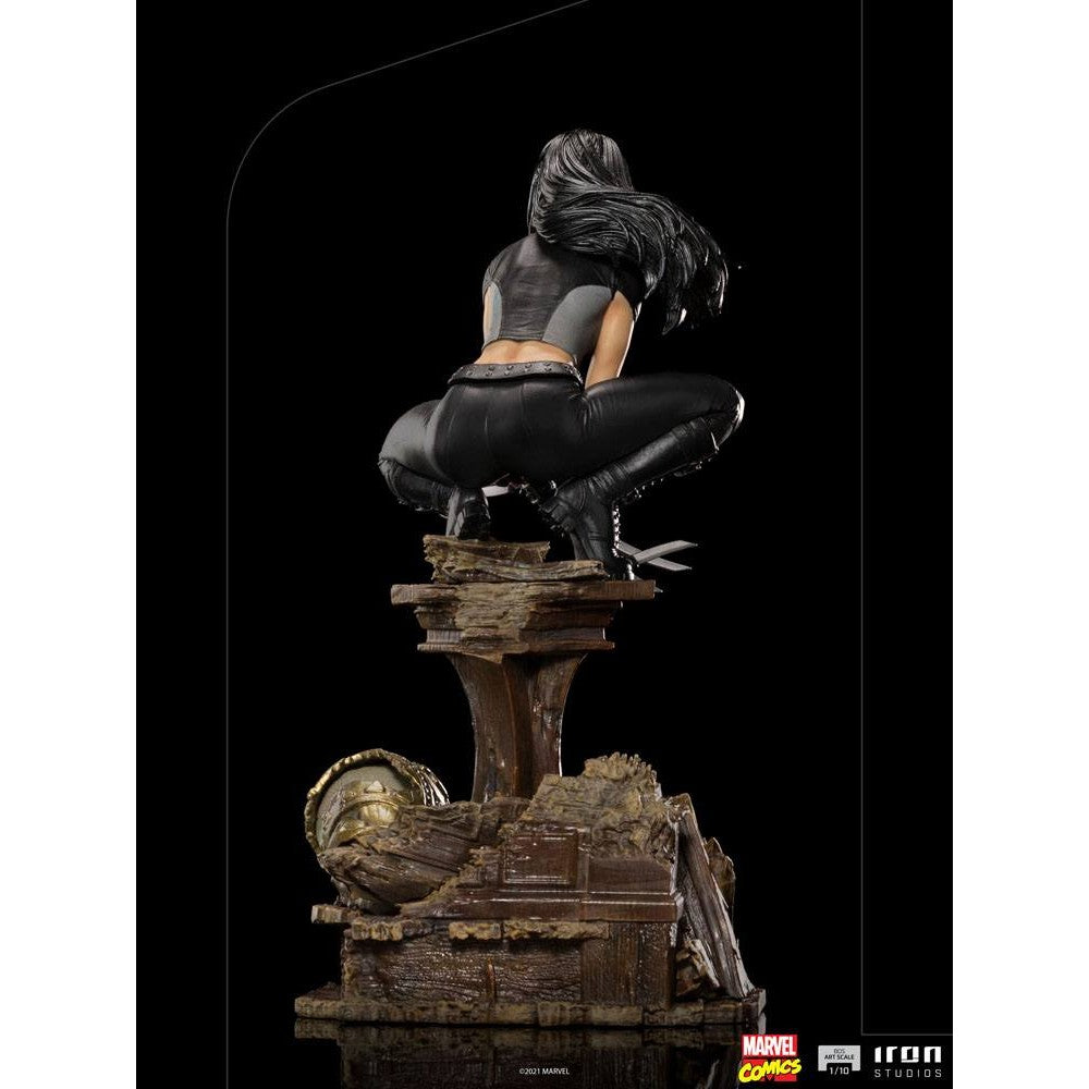 With her razor-sharp claws, fists, and feet unsheathed, the young mutant heroine poses on the rubble of demolished Mansion X, leaning on the remains of a wooden pillar, with an urn containing an ancestor`s ashes lying at her feet. She prepares to jump in and unleash all her fury against the invading forces at her home led by Magneto, the villain-controlled Sentinel Robots, and their followers, and defend her adoptive family, the X-Men, and their allied group X-Force. Expanding the largest collection of Marvel mutant heroes statues ever produced, Iron Studios introduces "X-23 - X-Men - BDS Art Scale 1/10" featuring the lethal Wolverine heiress. In a top-secret program, geneticist Dr. Sarah Kinney produced a female embryo using her own genetic material combined with material from the Canadian mutant Logan, thereby generating her daughter Laura Kinney, a clone of the wild mutant Wolverine. Raised in captivity, she was codenamed X-23 and was trained to be a killing machine, and even with outbursts of extreme rage and violence similar to her father`s, with the support of Logan and the other X-Men, Laura overcame her traumas and asserted her identity as the daughter of Logan and Sarah. Like Logan, X-23 has accelerated regenerative healing factor, longevity, and superhuman senses, but unlike her father, she has two retractable adamantium-coated bone claws on each arm and one on each foot. Created by writer Craig Kyle for the animation X-Men: Evolution in 2003, X-23 made her first appearance in the 41st episode of the series and was later featured in the comics on the adult-themed series NYX with a script by Joe Quesada and artwork by Joshua Middleton, and later the legendary Chris Claremont introduced her to the X-Men. In theaters, in the movie Logan, she was played in 2017 by Dafne Keen, in the 10th production of the X-Men film franchise.